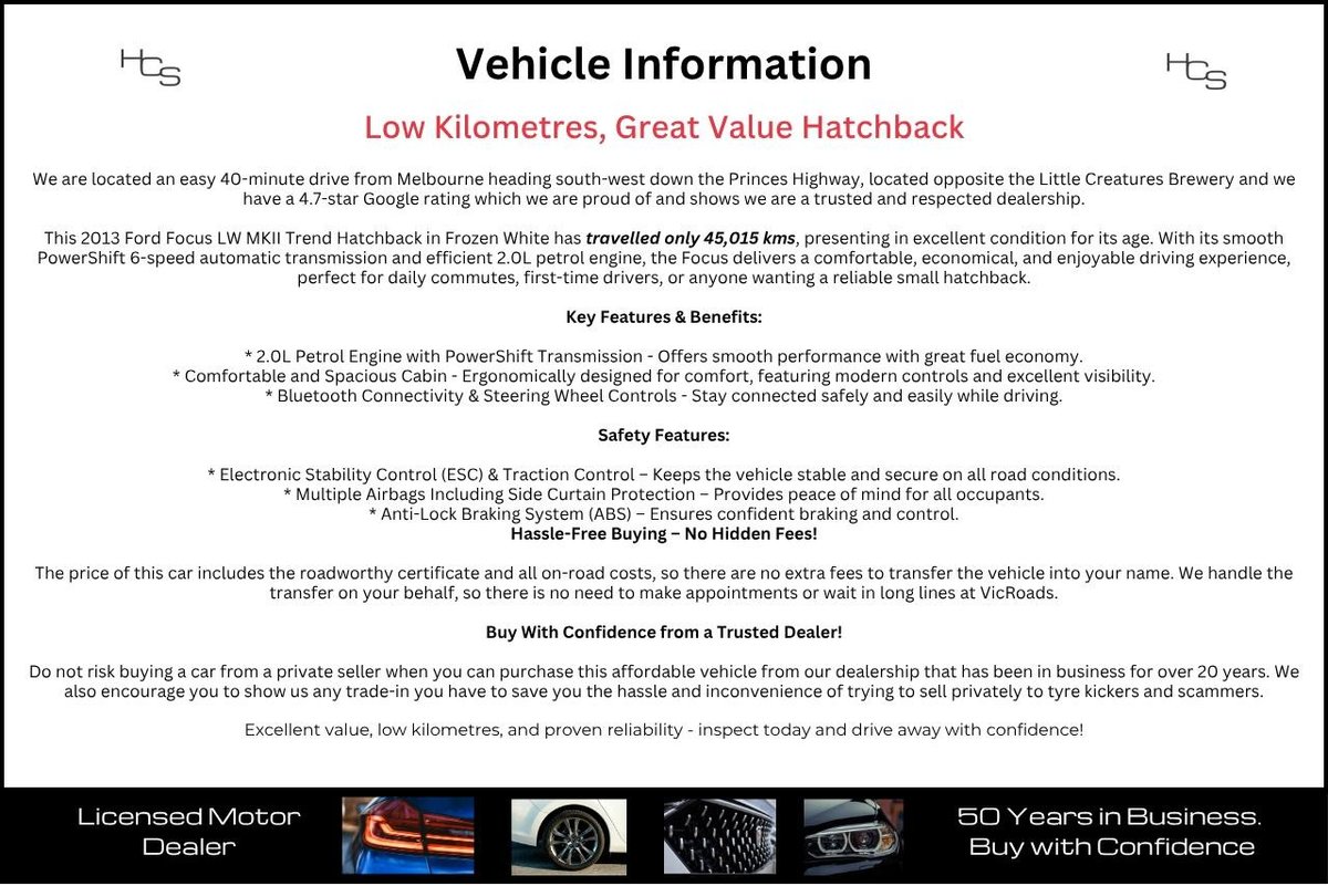 This 2013 Ford Focus LW MKII Trend Hatchback in Frozen White has travelled only 45,015 kms, presenting in excellent condition for its age. With its smooth PowerShift 6-speed automatic transmission and efficient 2.0L petrol engine, the Focus delivers a comfortable, economical, and enjoyable driving experience, perfect for daily commutes, first-time drivers, or anyone wanting a reliable small hatchback.