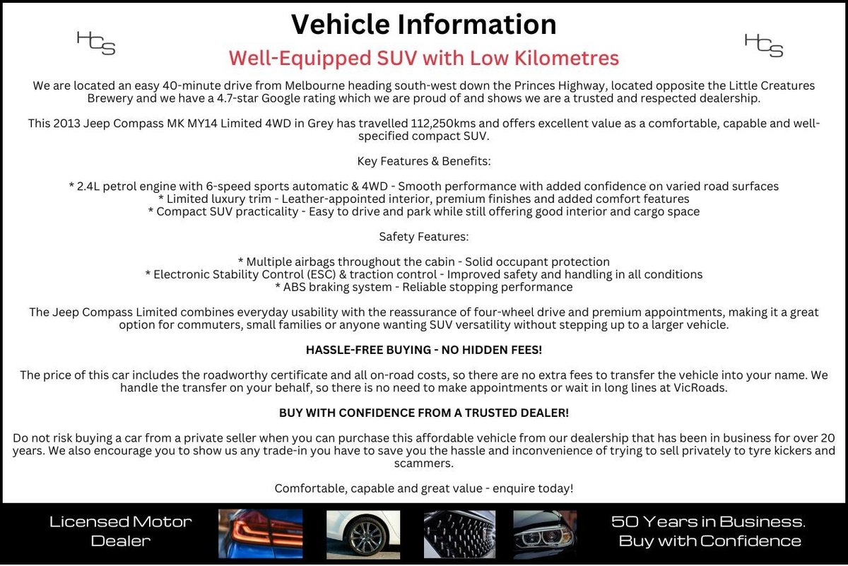 This 2013 Jeep Compass MK MY14 Limited 4WD in Grey has travelled 112,250kms and offers excellent value as a comfortable, capable and well-specified compact SUV.