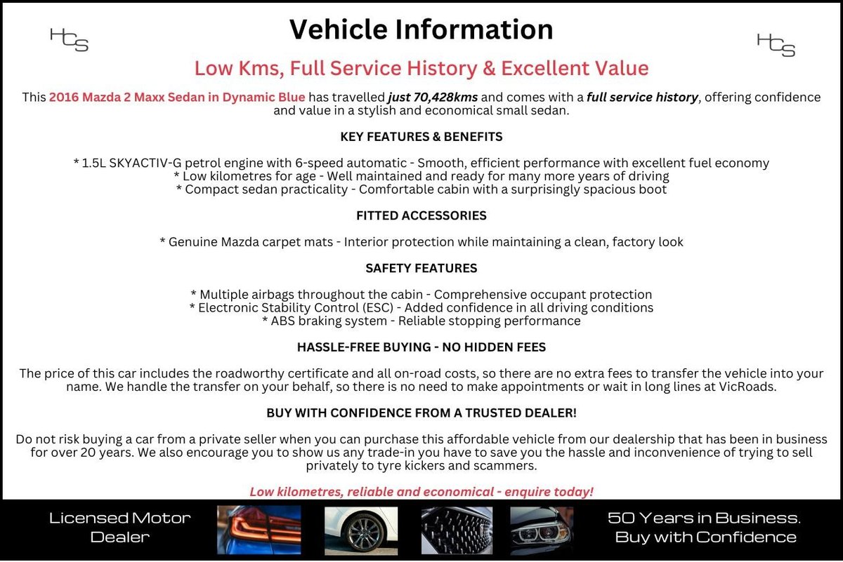 This 2016 Mazda 2 Maxx Sedan in Dynamic Blue has travelled just 70,428kms and comes with a full service history, offering confidence and value in a stylish and economical small sedan.