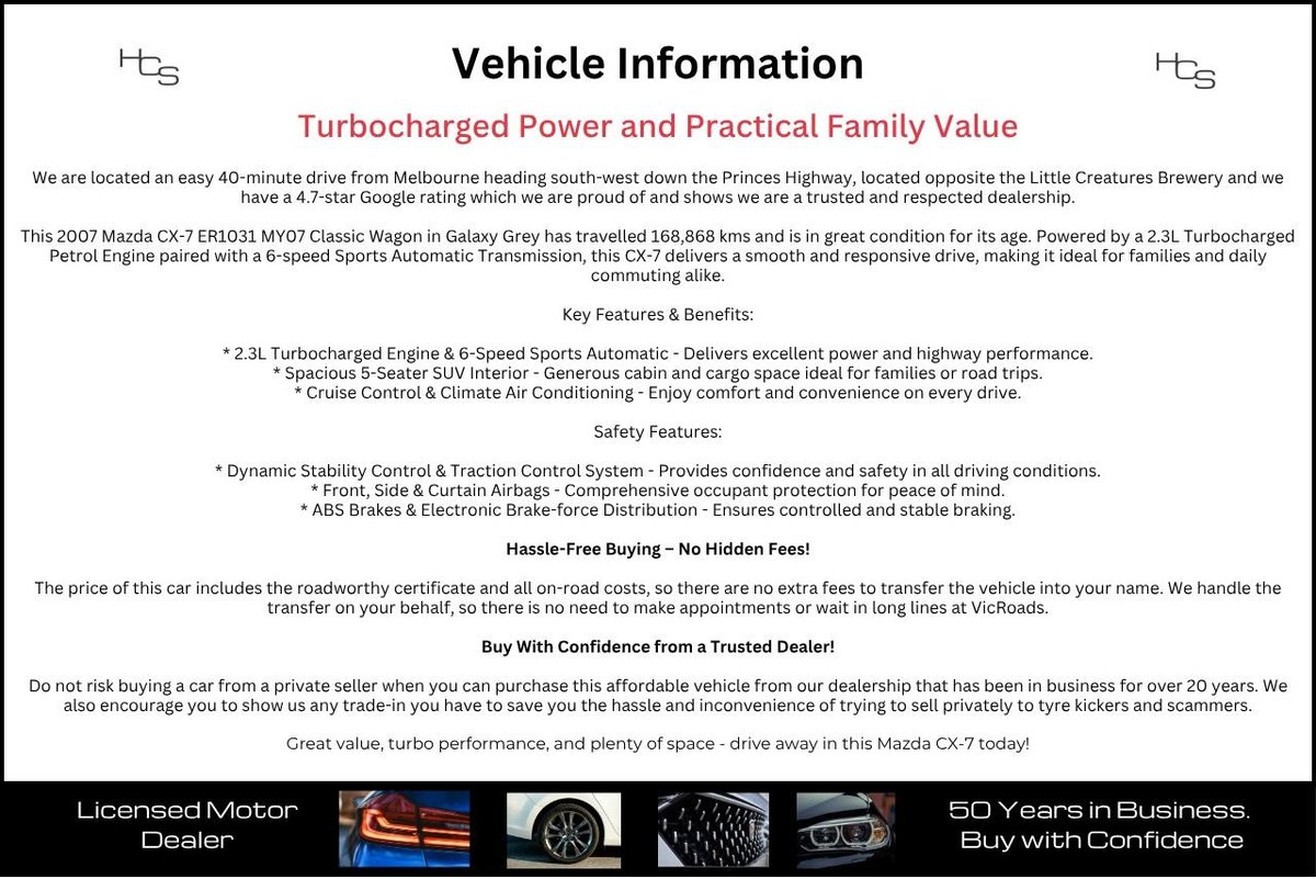 This 2007 Mazda CX-7 ER1031 MY07 Classic Wagon in Galaxy Grey has travelled 168,868 kms and is in great condition for its age. Powered by a 2.3L Turbocharged Petrol Engine paired with a 6-speed Sports Automatic Transmission, this CX-7 delivers a smooth and responsive drive, making it ideal for families and daily commuting alike.