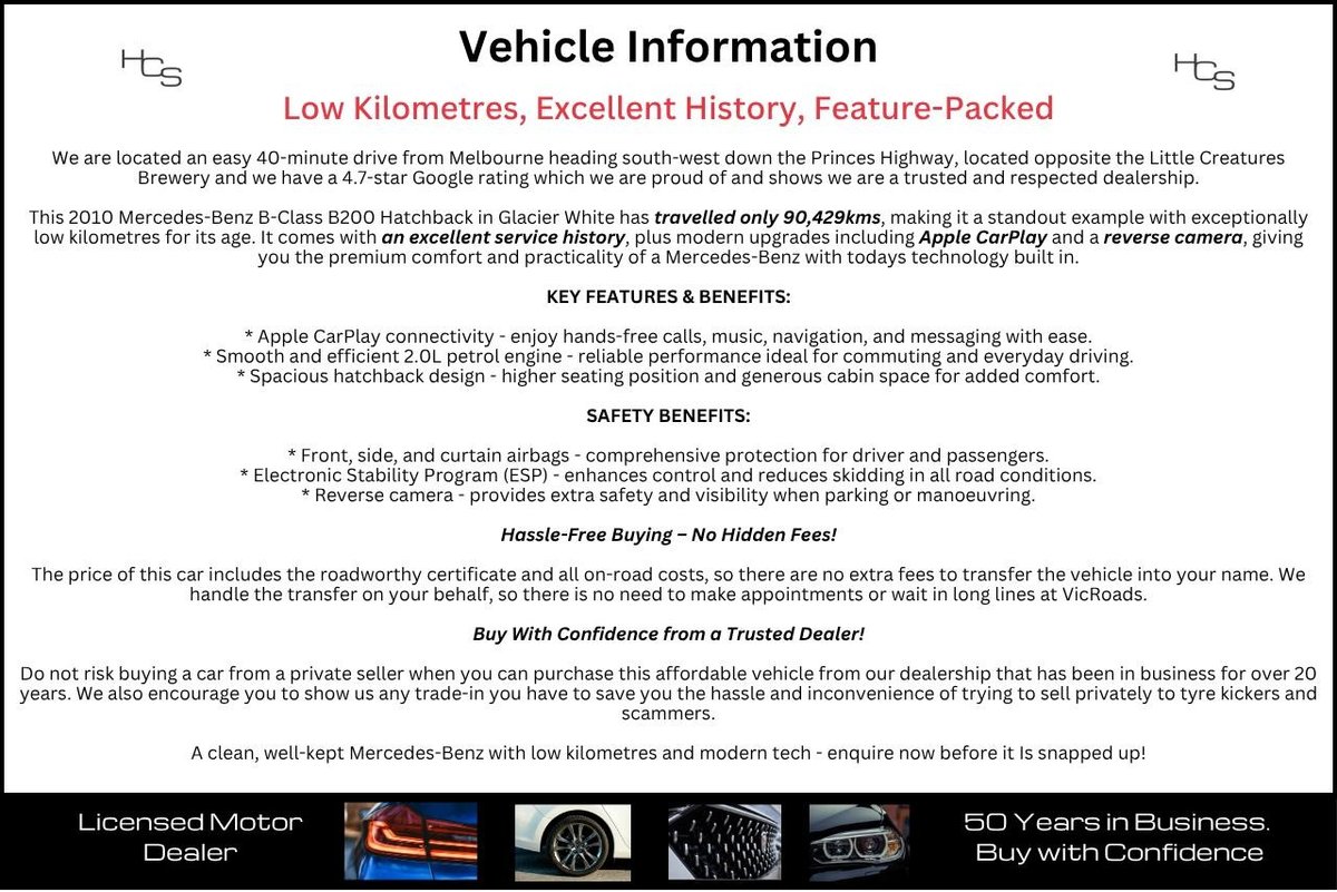 This 2010 Mercedes-Benz B-Class B200 Hatchback in Glacier White has travelled only 90,429kms, making it a standout example with exceptionally low kilometres for its age. It comes with an excellent service history, plus modern upgrades including Apple CarPlay and a reverse camera, giving you the premium comfort and practicality of a Mercedes-Benz with todays technology built in.