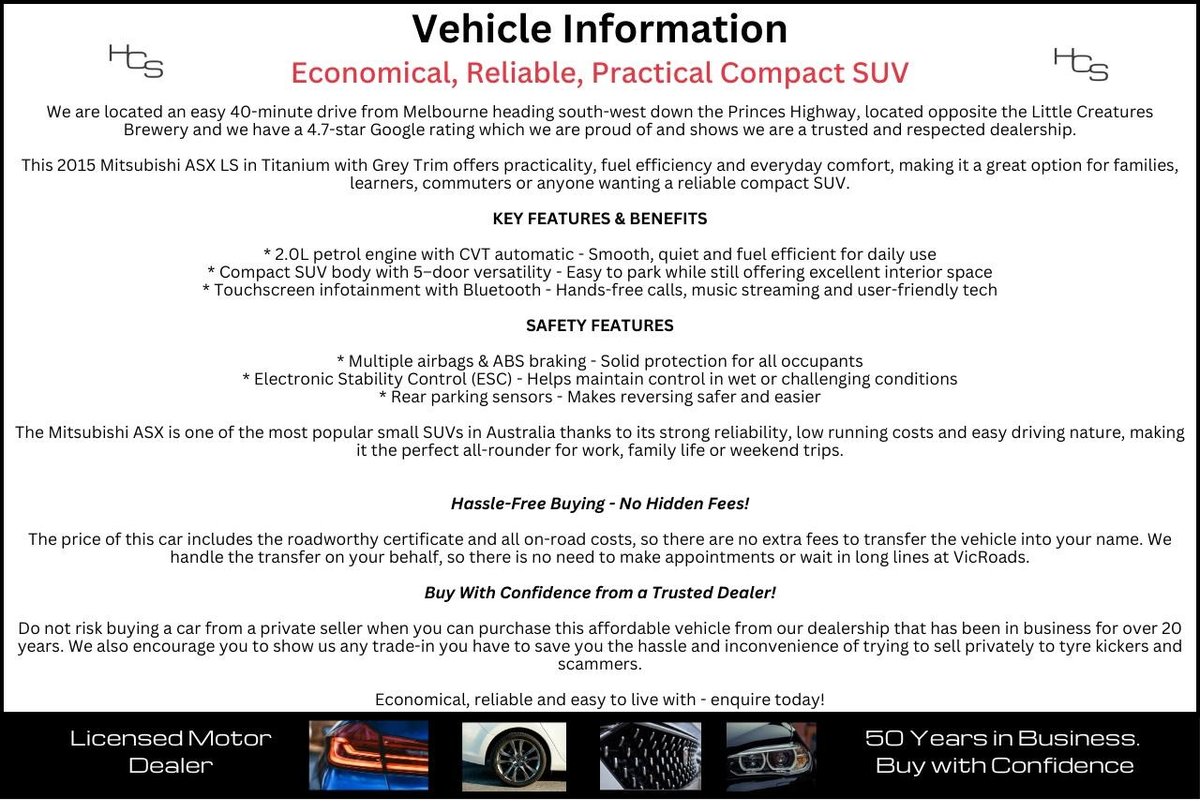 This 2015 Mitsubishi ASX LS in Titanium with Grey Trim offers practicality, fuel efficiency and everyday comfort, making it a great option for families, learners, commuters or anyone wanting a reliable compact SUV.