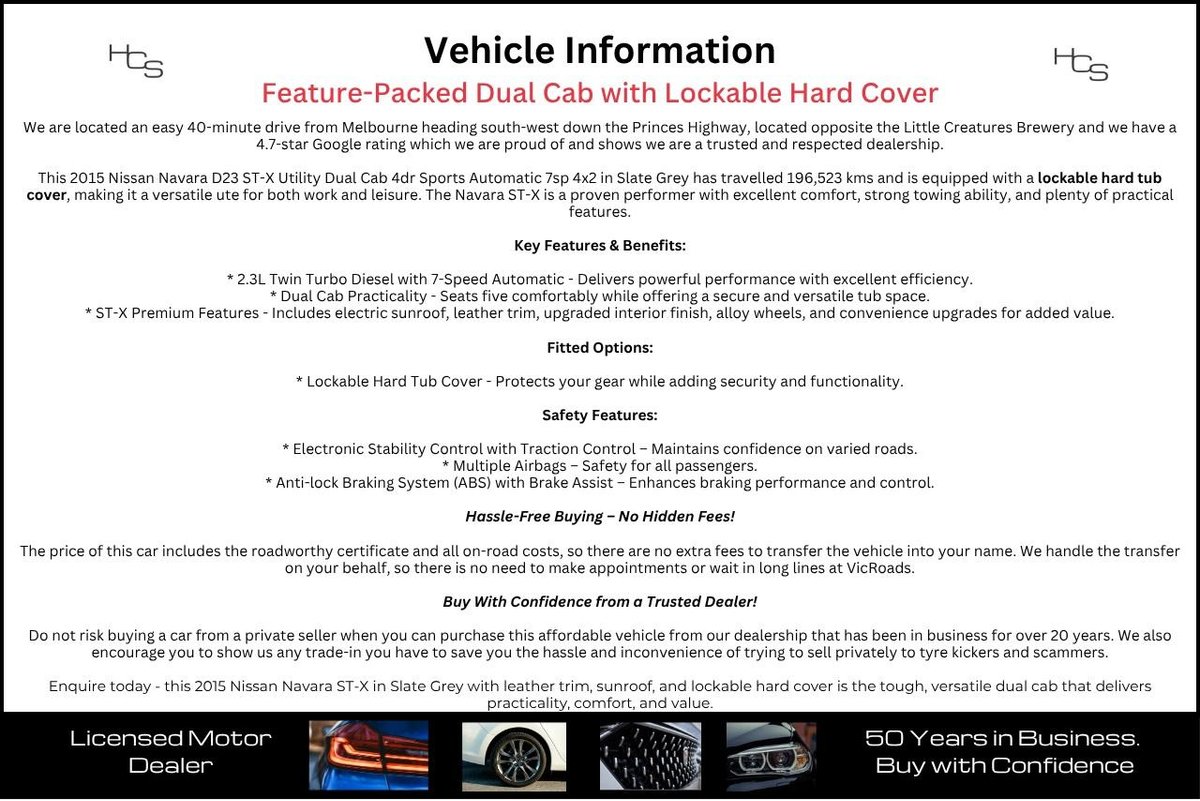 Enquire today - this 2015 Nissan Navara ST-X in Slate Grey with leather trim, sunroof, and lockable hard cover is the tough, versatile dual cab that delivers practicality, comfort, and value.