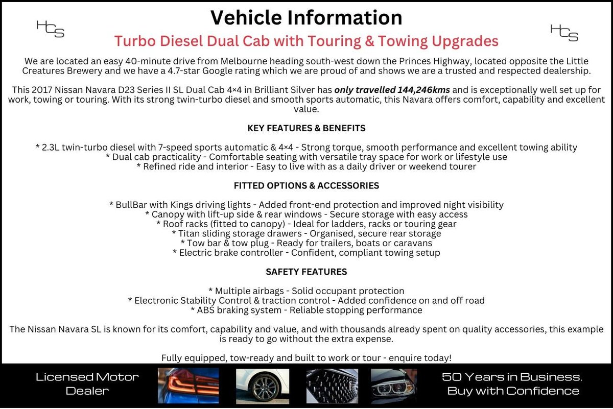 This 2017 Nissan Navara D23 Series II SL Dual Cab 4×4 in Brilliant Silver has travelled 144,246kms and is exceptionally well set up for work, towing or touring. With its strong twin-turbo diesel and smooth sports automatic, this Navara offers comfort, capability and excellent value.