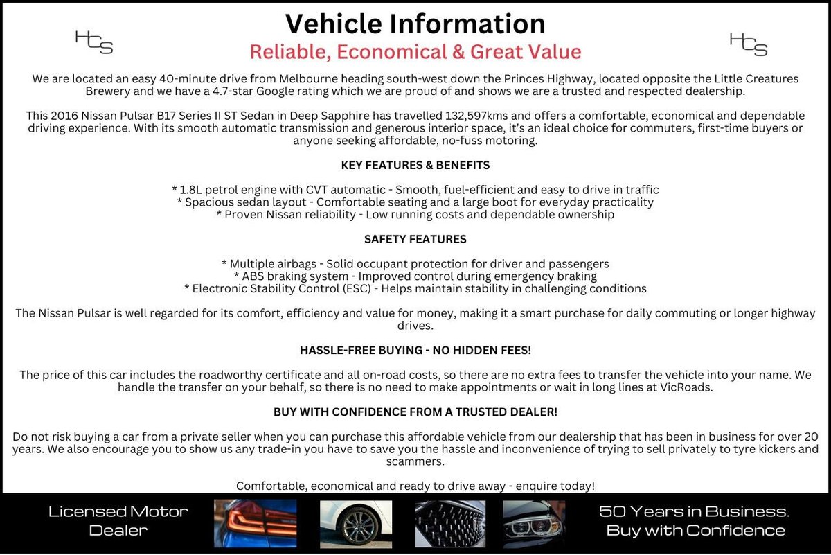 This 2016 Nissan Pulsar B17 Series II ST Sedan in Deep Sapphire has travelled 132,597kms and offers a comfortable, economical and dependable driving experience. With its smooth automatic transmission and generous interior space, it’s an ideal choice for commuters, first-time buyers or anyone seeking affordable, no-fuss motoring.