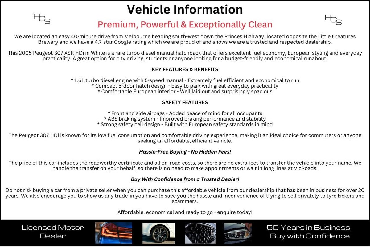 This 2005 Peugeot 307 XSR HDi in White is a rare turbo diesel manual hatchback that offers excellent fuel economy, European styling and everyday practicality. A great option for city driving, students or anyone looking for a budget-friendly and economical runabout.