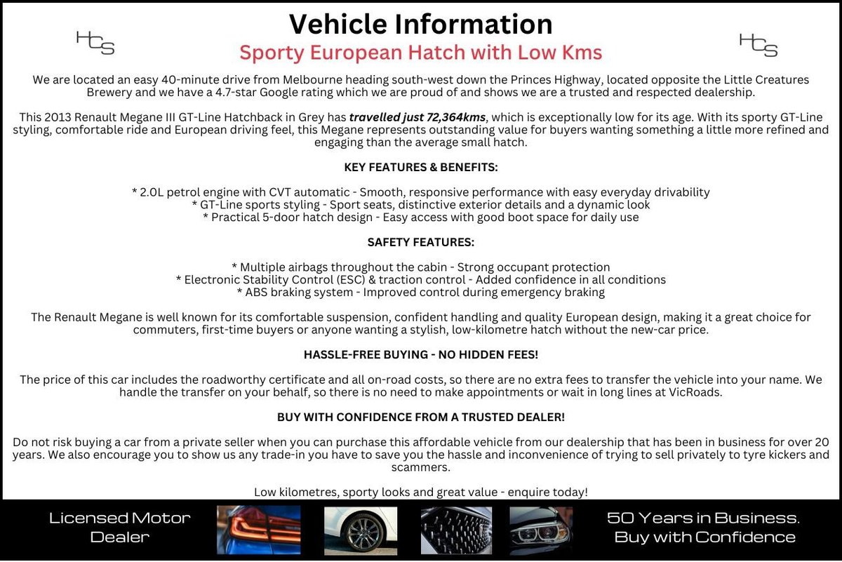 This 2013 Renault Megane III GT-Line Hatchback in Grey has travelled just 72,364kms, which is exceptionally low for its age. With its sporty GT-Line styling, comfortable ride and European driving feel, this Megane represents outstanding value for buyers wanting something a little more refined and engaging than the average small hatch.