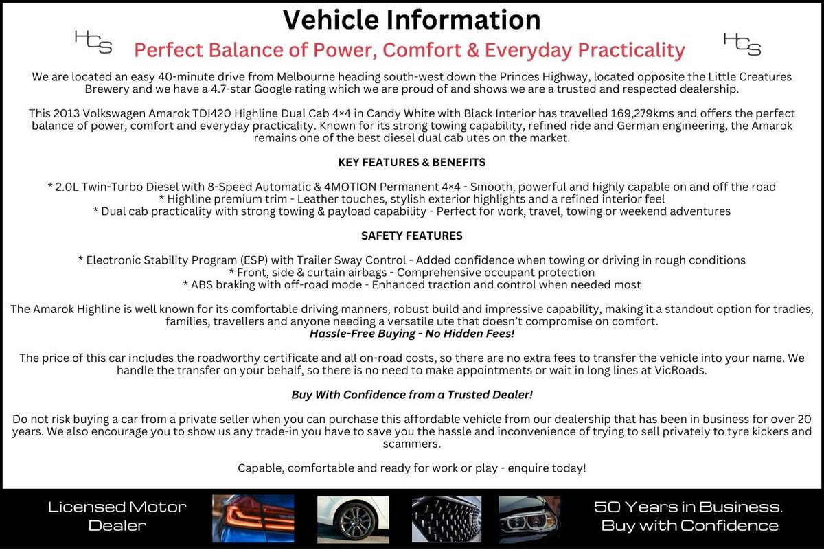 This 2013 Volkswagen Amarok TDI420 Highline Dual Cab 4×4 in Candy White with Black Interior has travelled 169,279kms and offers the perfect balance of power, comfort and everyday practicality. Known for its strong towing capability, refined ride and German engineering, the Amarok remains one of the best diesel dual cab utes on the market.