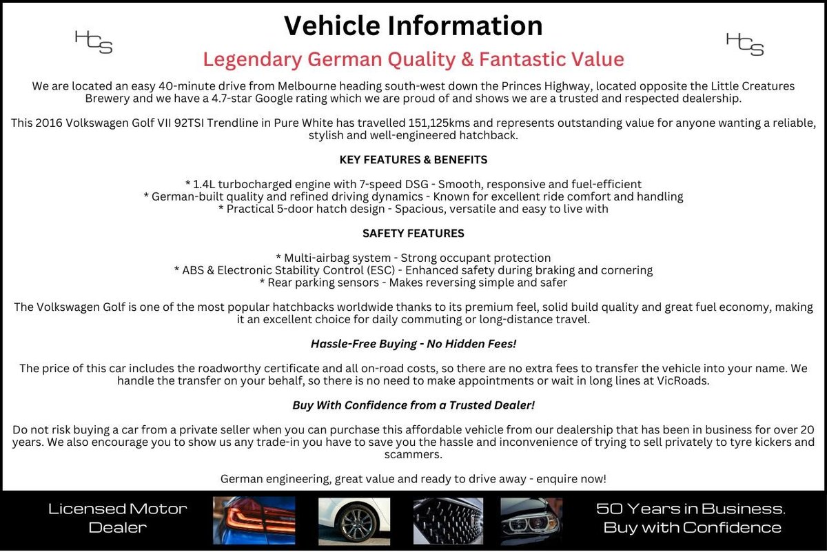 This 2016 Volkswagen Golf VII 92TSI Trendline in Pure White has travelled 151,125kms and represents outstanding value for anyone wanting a reliable, stylish and well-engineered hatchback.