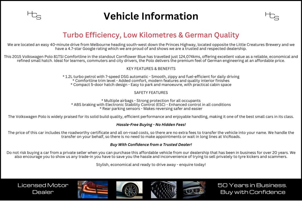 This 2015 Volkswagen Polo 81TSI Comfortline in the standout Cornflower Blue has travelled just 124,074kms, offering excellent value as a reliable, economical and refined small hatch. Ideal for learners, commuters and city drivers, the Polo delivers the premium feel of German engineering at an affordable price.