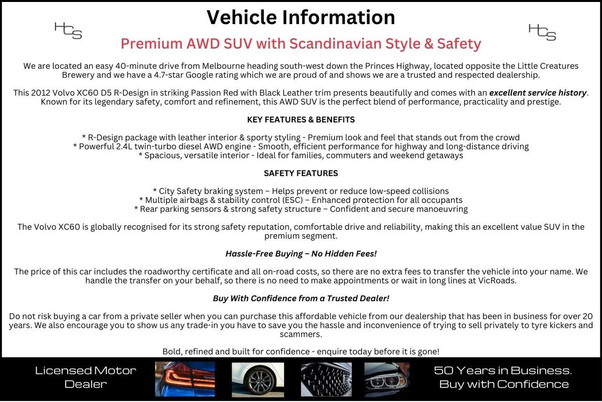 This 2012 Volvo XC60 D5 R-Design in striking Passion Red with Black Leather trim presents beautifully and comes with an excellent service history. Known for its legendary safety, comfort and refinement, this AWD SUV is the perfect blend of performance, practicality and prestige.